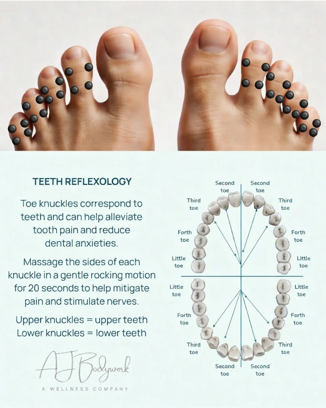 Foot zoning (reflexology) works with specific points on the feet that correspond to different areas of the body, including the teeth and jaw, and can help relieve pain and promote balance.